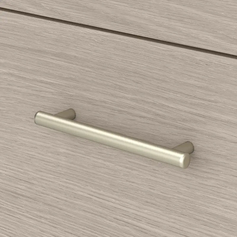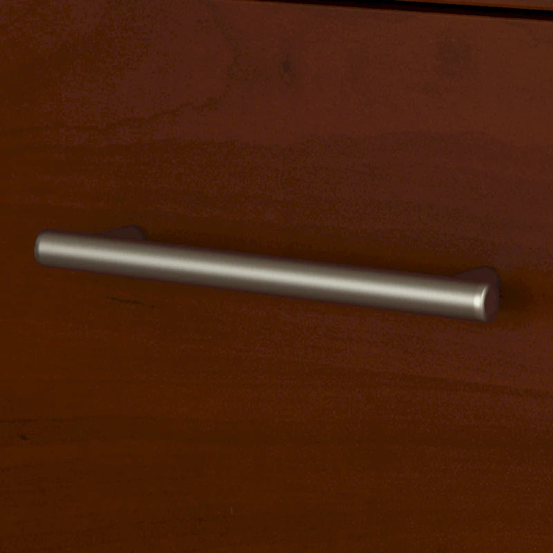 - Transitional styling includes tapered leg accents, an elegant finish and contemporary metal hardware